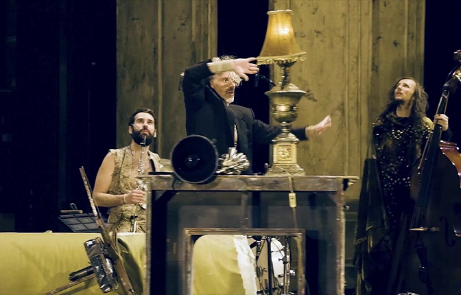 שלושה עשר נגנים ורקדנים, יוצאי דופן ומשוגעים-לדבר בלי מסיכות, מול הקהל, תובעים חזקה על הזמן והמקום. הגופות והצלילים מתאחדים, חלק אחרי חלק, עד הגיעם לשיא.